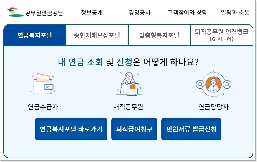 공무원 연금관리공단 홈페이지에서는 퇴직공무원 지원 서비스도 다양하게 운영 중이에요.